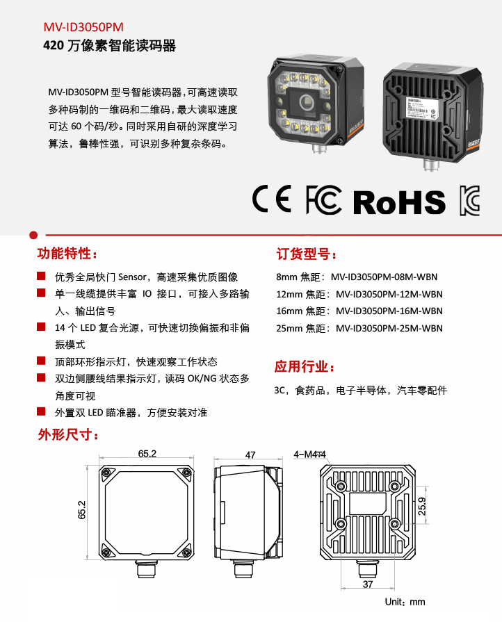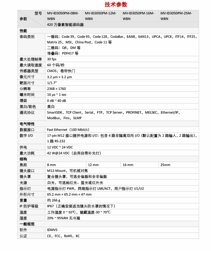 ?低曋悄茏x碼器420W像素 MV-ID3050PM-08M/12M/16M/25M-WBN