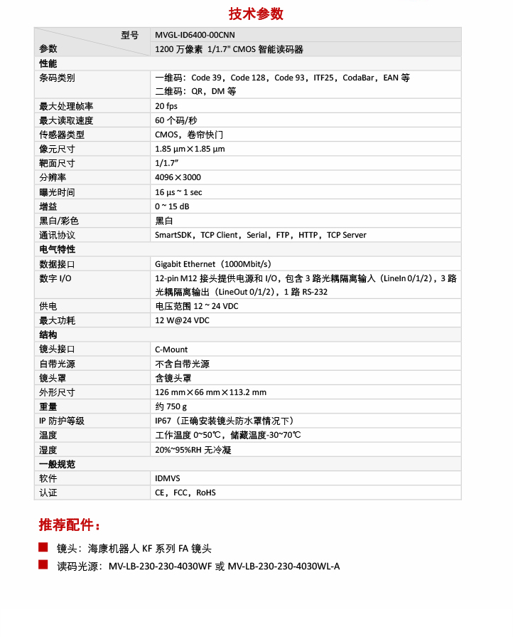 ?低曋悄茏x碼器1200W像素 MVGL-ID6400-00CNN 1/1.7”