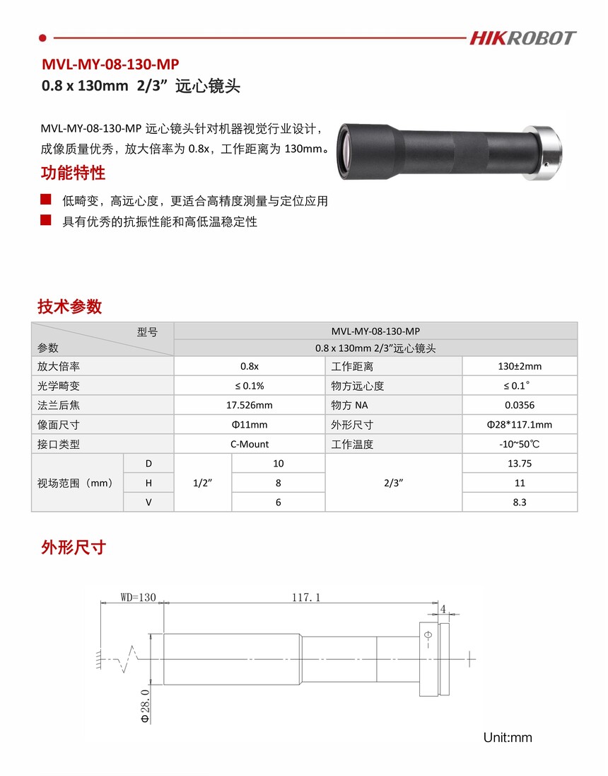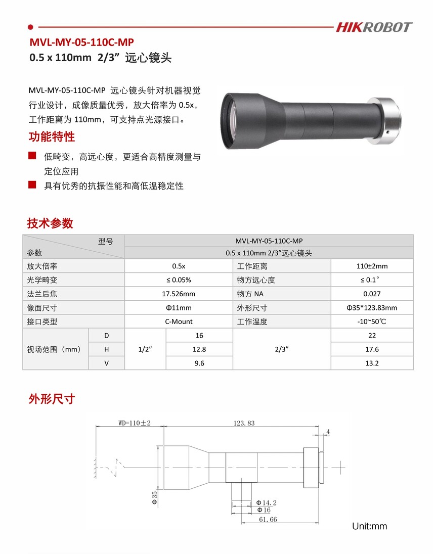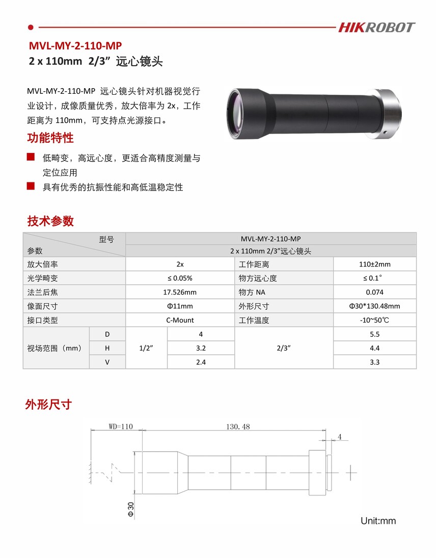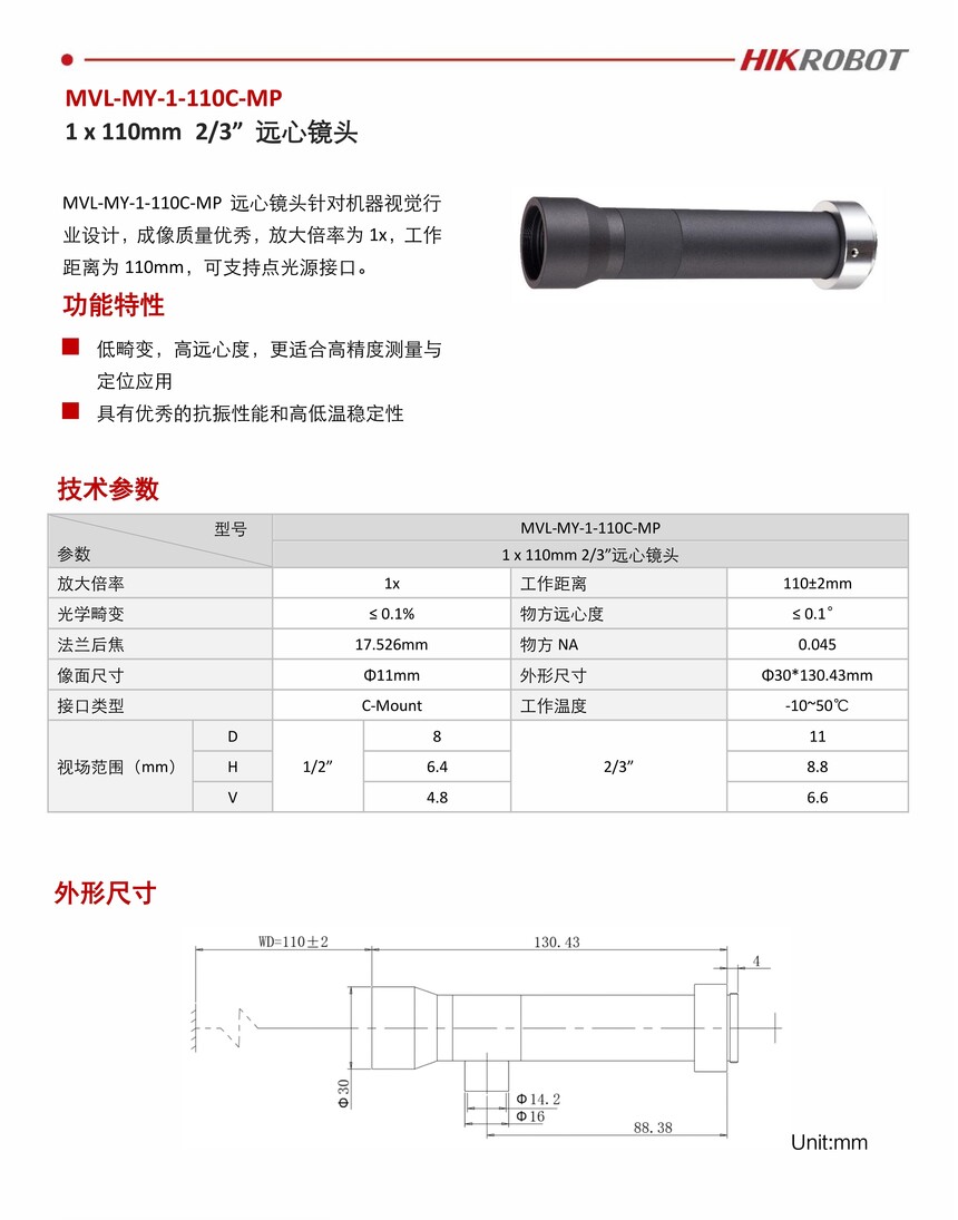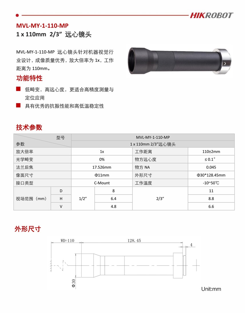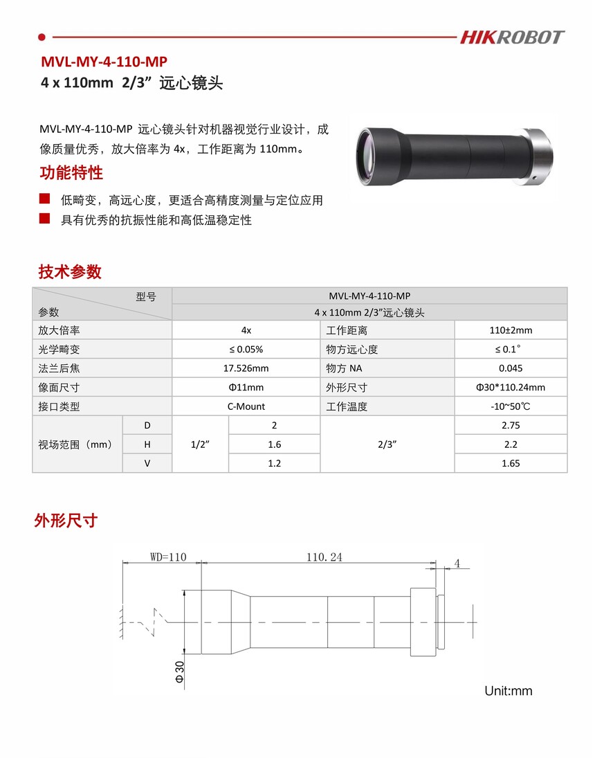 海康威視遠心鏡頭MVL-HY-4-110C機器視覺工業(yè)鏡頭